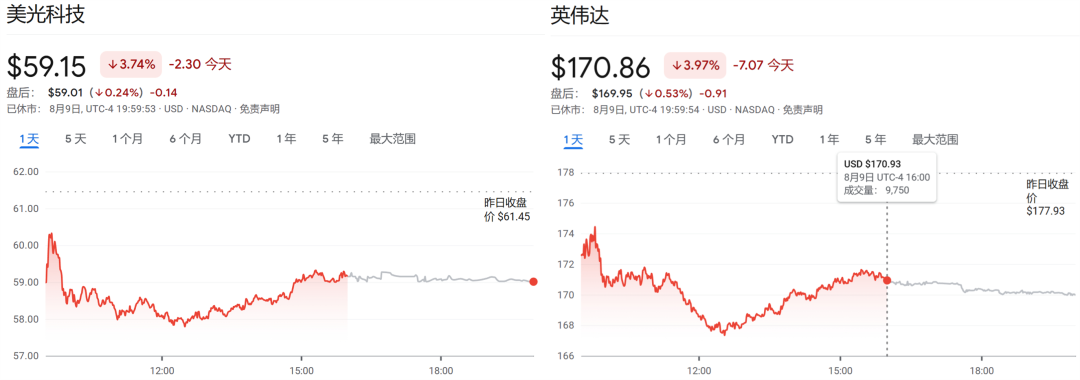 在拜登签署《芯片与科学法案》当天,美股尤其是芯片股全线大幅下跌。其中,美光科技收跌 3.74%,英伟达收跌 3.97%。这两大芯片制造厂商都先后下调了业绩预期。