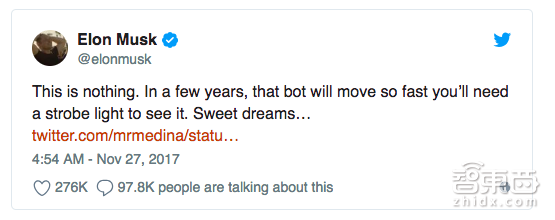 在视频上传之后,美国知名企业家——马斯克,表达了对Atlas奔跑的“担心”。他在推特上发文称:“这没什么。几年后,这个机器人会因为移动得太快,只能在闪光灯下能看到它了。美梦…”