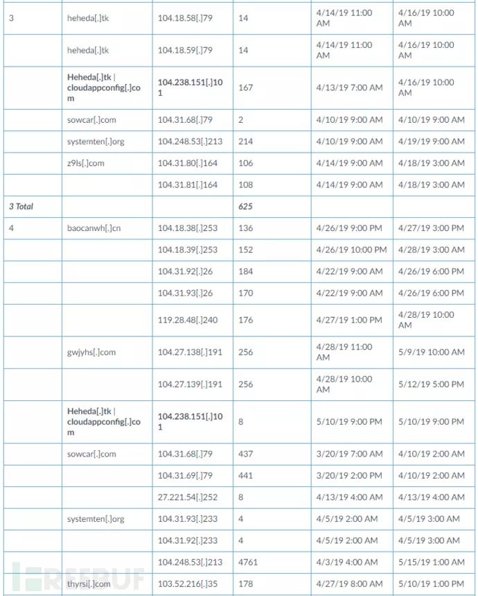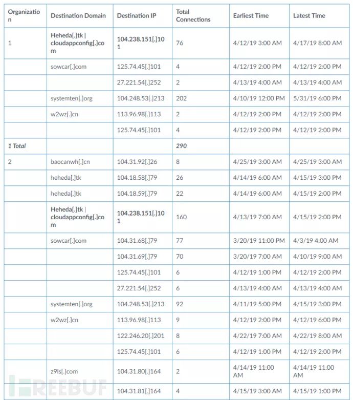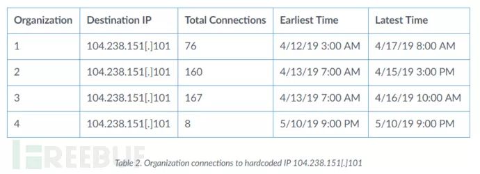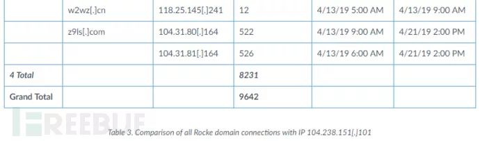 从104.238.151.101推断,这四个组织也与其他已知的Rocke域相关联。 组织1在2019年4月12日至5月31日期间连接到三个Rocke域,有290个连接。 组织4在2019年3月20日至5月15日期间连接到7个域,具有8,231个连接。 如表3所示,四个组织在与Rockede的硬编码IP地址104.238.151.101连接的时间段内连接到七个已知Rocke域中的一个或多个。
