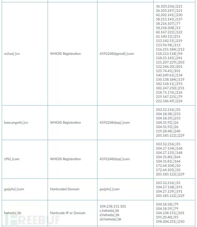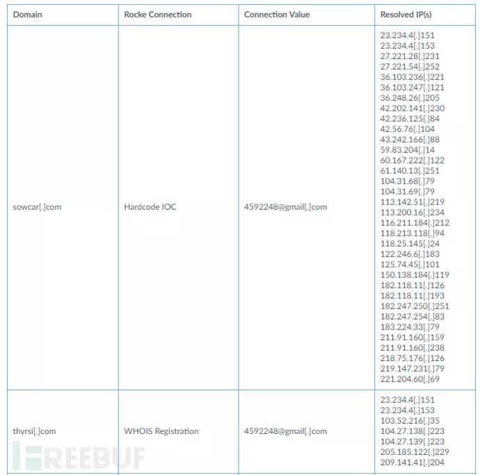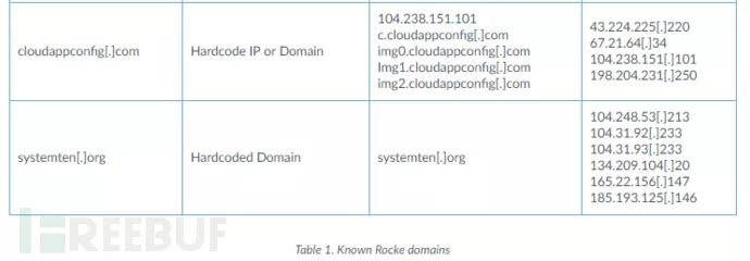 Rocke通过硬编码IP地址,URL地址、域名注册与受害人进行连接,将8个域与Rocke C2操作联系起来。 下图列出了域和Rocke基础架构(参见表1)。