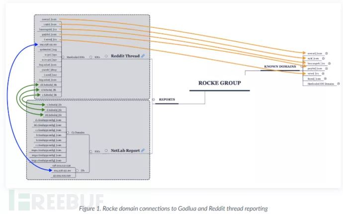 正如Godlua分析报告中所见,IP地址104.238.151 .101和URL d.heheda.tk,c.heheda.tk和dd.heheda.tk为硬编码。 发布到Reddit的与Rocke组织有关的恶意软件中也发现C2连接被发送到三个heheda. tk域,这些域已解析为IP地址104.238.151.101。 另外,样本包含已知的Rocke域sowcar[.]com, z9ls[.]com, baocangwh[.]cn, gwjyhs[.]com,和 w2wz[.]cn.的硬编码值。有关如何将已知的Rocke域与从Godlua和Reddit IoC报告中提取请参见图1。