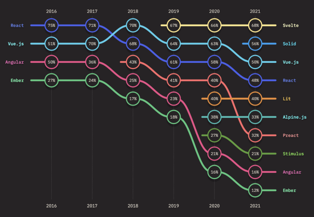 过去流行的是 Angular,然后是 React,现在是 Vue.js……其他的像 Ember、Backbone 或 Knockout 什么的几乎都快消失了。一些标准,例如 Web Components,则很少被使用。似乎每年都会发布一些新框架,比如 Svelte、Aurelia,而且每个框架在服务器端都有对应的对象(开头那些框架对应的 NestJS、NextJS 或 Nuxt,Svelte 对应的 Sapper,等等)。非 JavaScript Web 框架(如 Django、Spring、Laravel、Rails 等)就更不用说了。甚至还有框架之上的框架(Quasar、SolidJS)、为框架生成组件代码的框架(Stencil、Mitosis),以及 NCDP(无代码开发平台,No-Code Development Platform)。