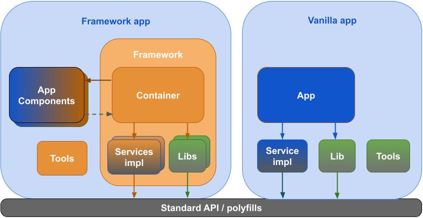 不过,标准框架并不存在孤井。在 Web 平台(即浏览器框架)上,使用标准 Web API 可以降低你的投入风险,因为它们可以在大多数浏览器上运行。即使不是所有的浏览器都支持,仍然可以通过 polyfill 来弥补。