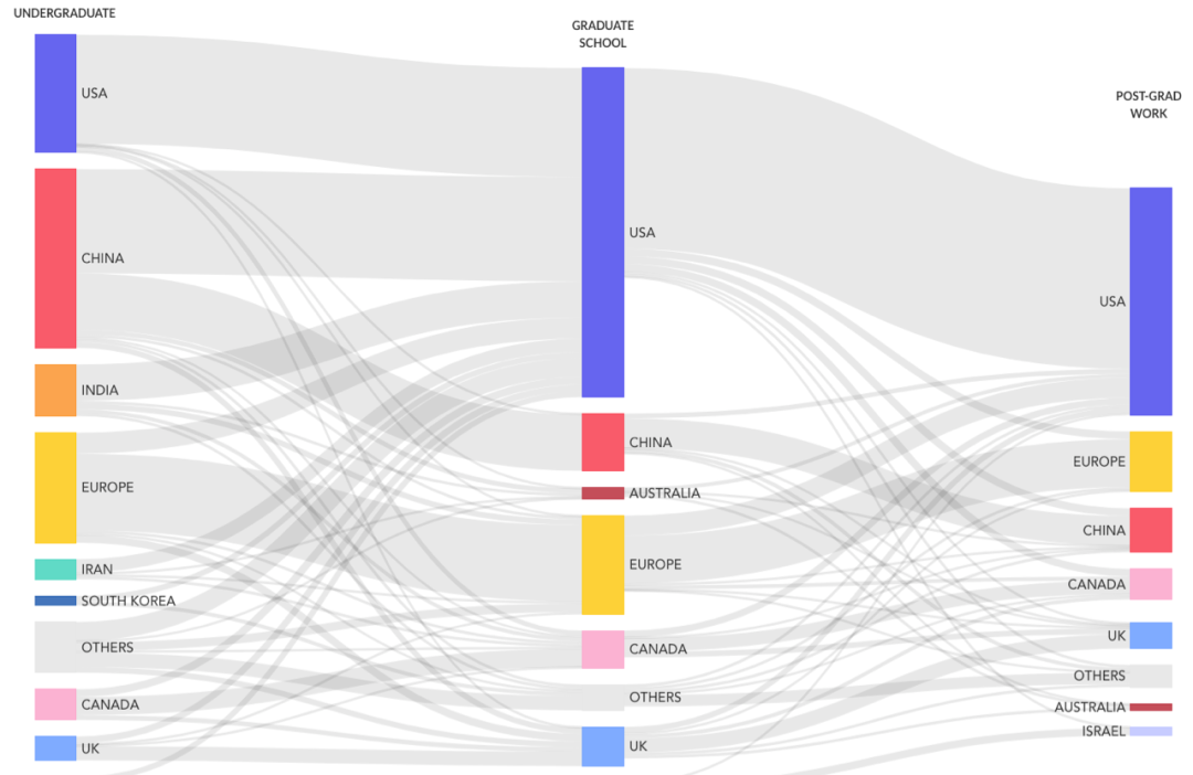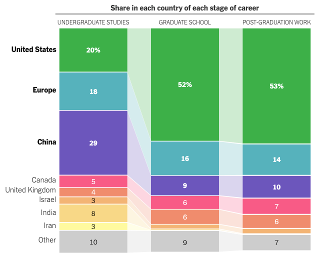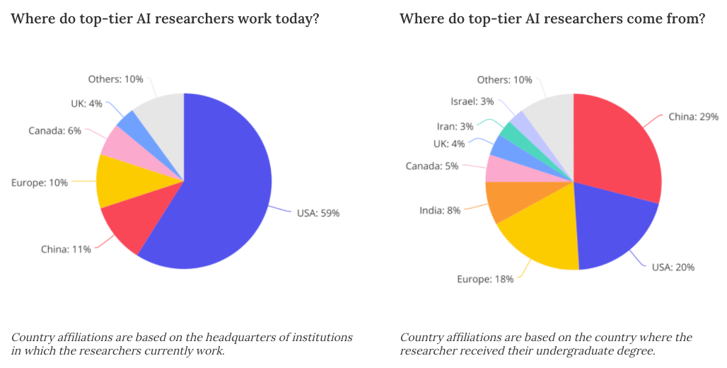 中国,已经成为全球人工智能研究者的最大输出源国家。美国人工智能领域的顶尖研究者中,有近三分之一来自中国。在麦克罗波洛智库分析师马特 · 希恩看来,美国政府近期一系列面向国际研究者的「驱逐政策」,最终削弱的将是美国自身的国际竞争力。