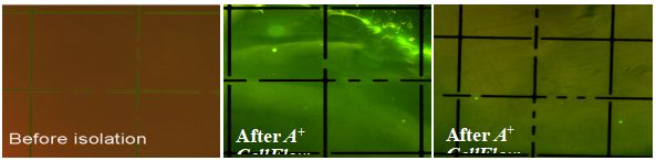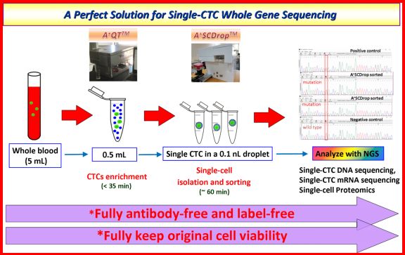 A+SCDropTM是利用油包水(water-in-oil)的乳化技术结合高速细胞介电特征分析技术。此晶片系统可将A+QTTM富集后的产物样本,分成数百万颗0.1 nL的极小液滴,由于全血经A+QTTM富集后的样本仅剩CTC与数万颗WBCs(~104 WBCs/0.5 mL),因此每颗小液滴中最多仅会存在一颗细胞,再由具独创专利技术的的高介敏介电特性侦测系統,深度分析液滴中的介电特征,可精准分辨空液滴、包覆WBC的液滴、包覆CTC的液滴等,5 mL全血经A+QTTM (>85%)+ A+SCDropTM(>70%)系统后,可捕获近7成的单细胞CTC液滴,仅低于5颗以内的WBCs可能会被误判(本系统80%以上的实验数据WBCs均在3顆内),侦测后的单颗CTC可由本系统的自动化平台连动的分派入各自独立的单一反应小试管内,进行100% CTC丰度的全基因扩增。由于本系统所有机制(富集、单细胞分离、侦测、分选)均为纯自然物理的机制方法,无损细胞活性,实验数据结果显示,经本整合系统取得的单细胞全基因扩增(WGA)成功率高达80%以上,相比于现有市面上的单细胞捕获平台(存在染色或化学性破坏),大幅提升了超过30%以上的WGA成功率。此平台相关技术已申报13项国内外专利。