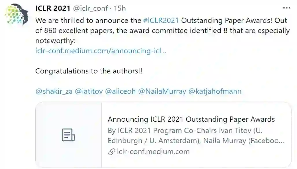 本届 ICLR 会议的接收率为 29%,相较 2020 年的 26.5% 有所提升。另外,值得关注的是,不同于 2020 年的 30 余篇满分论文,本届会议只有 15 篇论文获得了平均 8 分及以上的分数,也没出现「满分论文」。