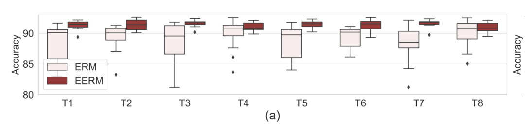 我们考虑使用GCN作为预测模型主干,下图分别显示了使用传统方法(Empirical Risk Minimization,ERM,即直接优化训练数据的损失)与本文提出方法(EERM)在Cora和Amazon数据集上8个测试图的准确率(Accuracy)对比。这里,我们重复了20次实验(使用不同网络初始化),展示了准确率的分布情况。可以看到,EERM在绝大多数情况下明显好于ERM。
