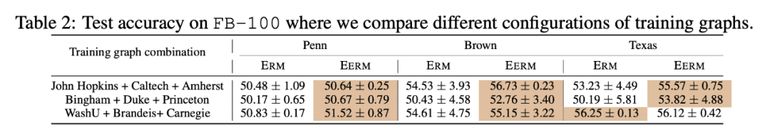 对于Facebook数据集,我们考虑使用多个图进行训练。具体的,我们考虑三种训练子图的组合。下表显示了使用不同训练子图的组合,在三个测试图(Penn,Brown,Texas)上的准确率对比。同样,EERM在绝大部分情况下超越了ERM,取得了最高7.2%的提升。