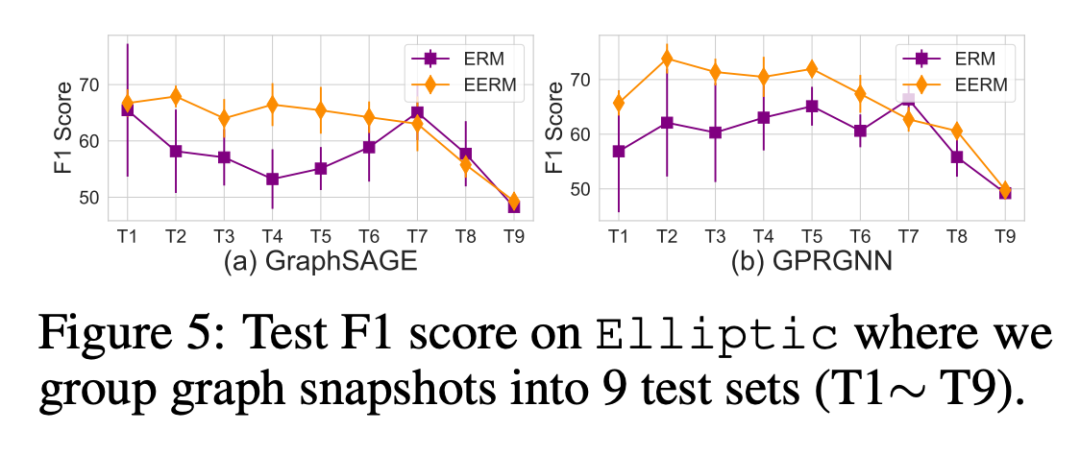 我们使用F1分数作为评测指标,下图显示了使用GraphSAGE和GPRGNN作为主干模型的效果对比。可以看到,EERM显著好于ERM,取得了平均9.6%/10.0%的提升。