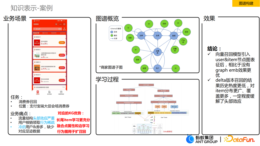 图谱认知这部分我主要介绍知识表示的一个案例。在支付宝中有一个会场消费券的频道场景(超级567),我们做的是消费券内容理解和深度召回。深入这个场景可以看到,用户需求是很明确的,但是也会有几个痛点,一个是流量结构的头部效应非常严重,通过行为召回的一般都会有马太效应;另一个是用户核销领取行为稀疏,一周或者一个月只进行几次浏览点击;还有不仅是冷启动的用户很多,每天新增的券也很多,新增券背后隐藏着用户的行为很少。