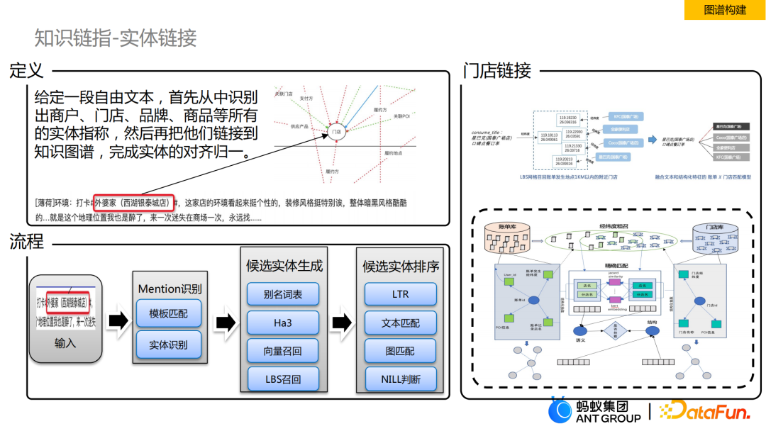 我们以消费记录里门店链接作为简单的案例。文本就是一条消费记录,我们主要通过网格的LBS进行召回,召回一公里内的门店信息,然后进行匹配和排序。具体来讲,在匹配任务上,我们尝试了最简单的精准匹配,我们对消费记录中的门店做了结构化提取,同时对门店库中的门店也做了结构化,将这两部分信息做精准匹配。除了精准匹配外,我们也做了基于Bert模型的文本匹配。进一步我们对消费记录里的门店结构化信息同图谱关联,尝试图匹配。最后集成各种匹配方法,训练了LTR排序模型。