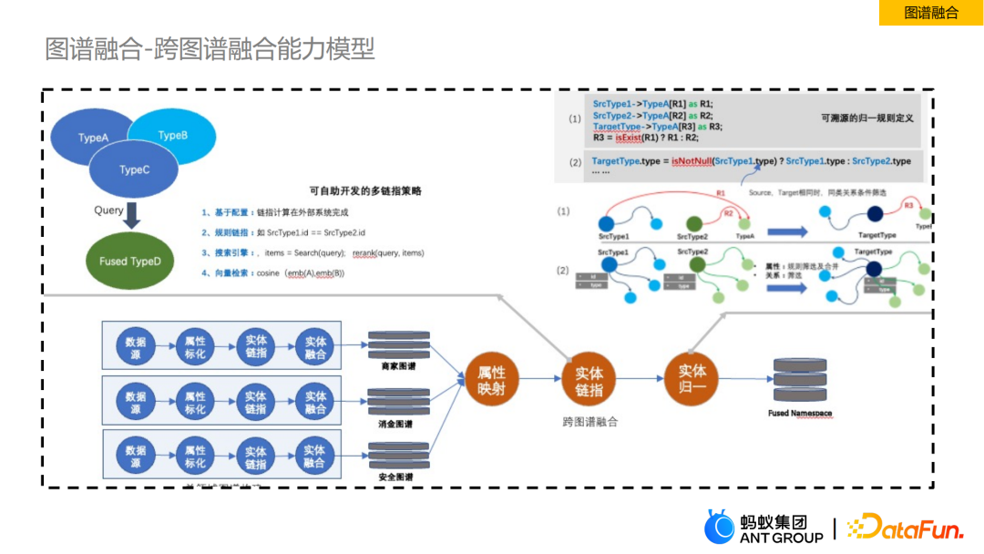 介绍完背景之后,我将简单介绍一下我们跨图谱融合能力的模型。左侧是不同业务领域图谱各自构建的pipeline,比如商家图谱、消金图谱和安全图谱,右侧在属性映射之后就是跨图谱融合的流程,这样设计的好处是各自领域图谱可以各自生产维护,互不影响,在跨图谱融合之后,可以用不同图谱的信息做实体链指和实体归一,最终形成融合后的图谱,以便于开展推理等相关工作。