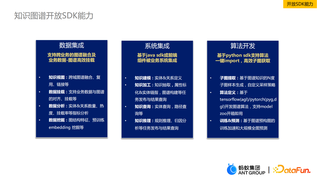最后介绍知识图谱开放SDK能力。SDK开放背后有三层集成的能力,第一个是数据集成,我们可以支持跨业务的图谱融合,以及获取到业务数据后直接挂载到图谱中,进一步可以做可视化分析。第二环节是系统集成,基于Java sdk做知识加工、知识建模、知识查询以及知识推理,快速完成图谱构建。第三部分是算法开放,我们会基于python sdk支持算法一键import,可以进行子图提取,也可以基于tensorflow或pytorch开发图谱算法。