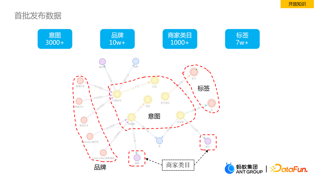 我们首批准备发布的数据是偏概念层的,简单介绍一下概念域里的知识,例如意图、品牌、商家类目以及标签,它们在图里是通过边进行关联。意图是一类复合概念,用户在支付宝中搜索时会带有较强的用户需求,例如“打车”、“查公积金”等,这些需求背后就是用户的意图。品牌不仅来源于支付宝认证的一些数据,也会从外网抓取一些品牌,并进行归一质检,最终沉淀了10万+的品牌。这些品牌与意图也是有关联关系的,比如通过“星巴克”品牌,人们很容易想到在星巴克买咖啡,这就与意图产生了关联关系。同时,每个意图也会和标签有关,比如“买女鞋”的意图下适用人群就是女生。