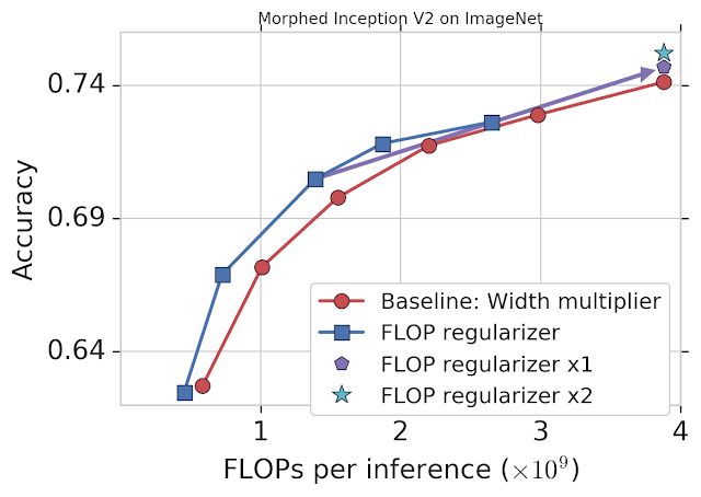 作为一个演示,我们将 MorphNet 应用于在 ImageNet 上通过目标定位 FLOPs 训练的 Inception V2(见下文)。基线方法是使用一个宽度倍增器,通过均匀地缩小每个卷积(红色)的输出数量来权衡精度和触发器。MorphNet 方法的目标是直接 FLOPs,并在缩小模型时产生更好的权衡曲线(蓝色)。在这种情况下,与基线相比,触发器成本降低了 11% 到 15%,而精确度相同。
