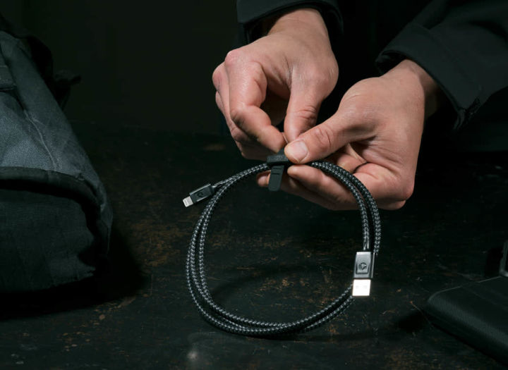 黑灰相间的尼龙材质让 Nomad Lightning 数据线看起来非常简洁硬朗。线缆中间部分还附有一条固定线扣,当你不需要使用数据线时,可以将它卷成圆圈状,并使用线扣进行固定,这样线缆就不会乱成一团了。