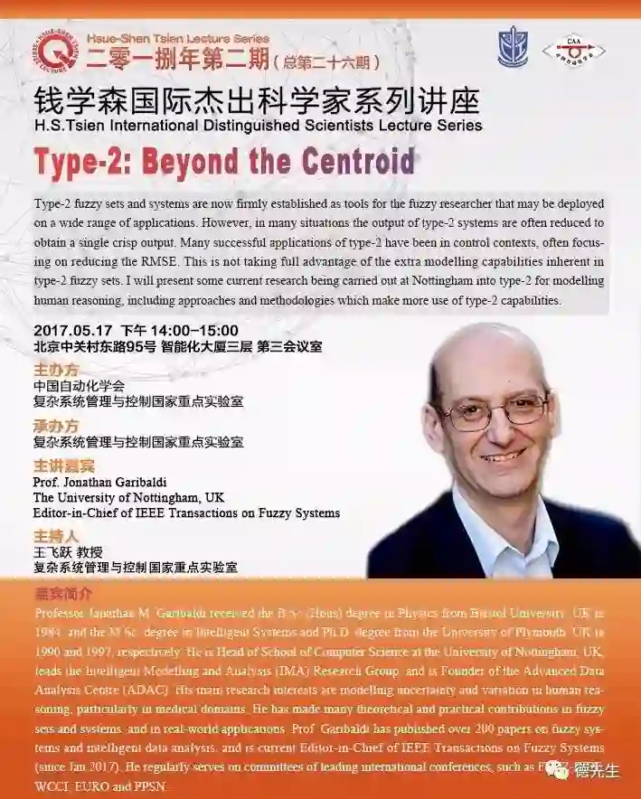 2018年第二期(总第二十六期)“钱学森国际杰出科学家系列讲座”将于5月17日在中科院自动化研究所举办。本期讲座邀请到英国诺丁汉大学计算机科学系教授Jonathan Garibaldi做题为“Type-2: Beyond the Centroid”的报告。当前,Type-2模糊集与系统作为模糊领域研究者的重要工具,可以部署在广泛的应用程序中。然而,在许多情况下,Type-2系统的输出常常会减少,并且许多成功的应用往往集中于减少均方根误差(RMSE),但这并没有充分利用type-2模糊集所固有的额外建模能力。Jonathan Garibaldi教授将介绍一些目前在诺丁汉大学进行的关于人工推理建模的type-2研究,包括更多使用type-2建模能力的方法。