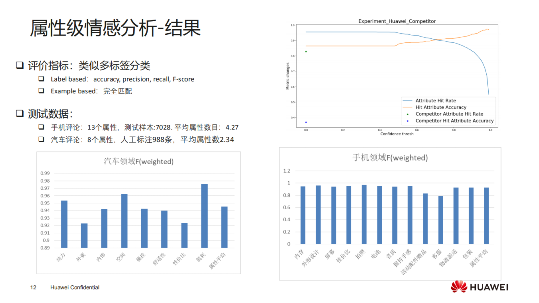 上面是我们最终的实验结果,针对汽车领域测试样本大概有7000多个,每个样本平均的属性数量是4.27个,其中预定义的属性集合是8个,最终可以看到每个属性的准确率都是很高的,基本上达到90%以上。针对手机领域的结果基本上也是每个属性F值基本上能达到将近90%。