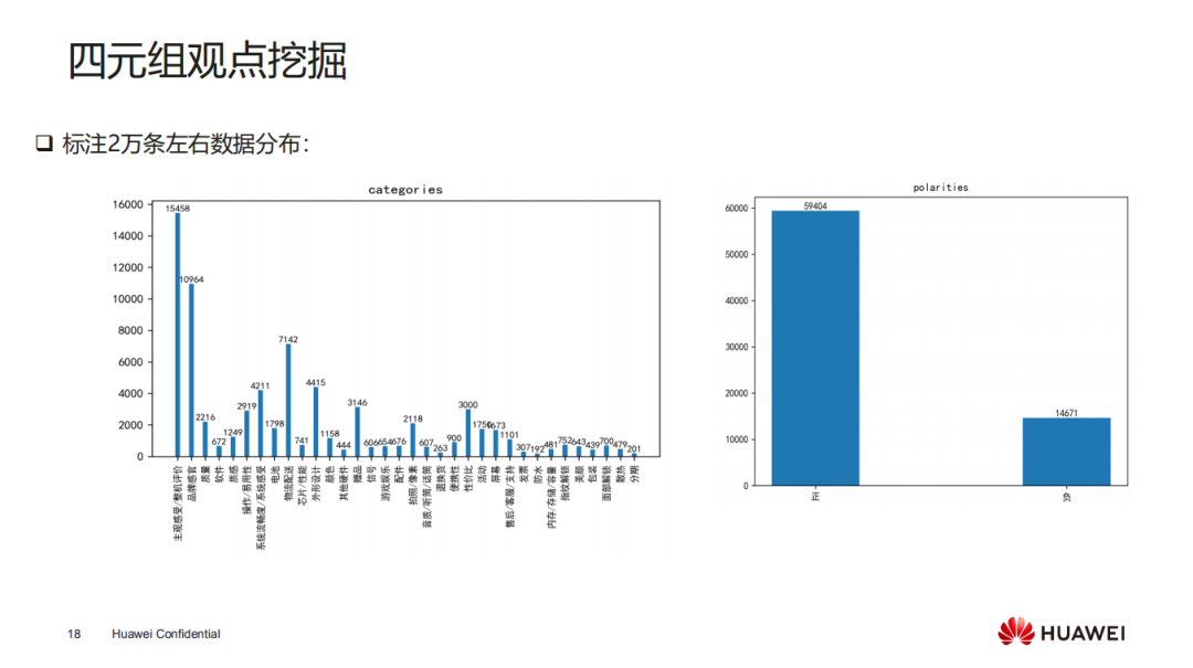 上图左边是我们标注大概两万条手机评论的数据分布,其实可以看到数据分布式非常不均衡的。这个是拿到真实用户在线上评论的数据,有些评论会偏的非常多,然而有些类别评论会非常少。上图右边是针对所有属性对应正负面的分布,这个也是非常不均衡的,正面的评论比较多,负面的评论会相对少很多。