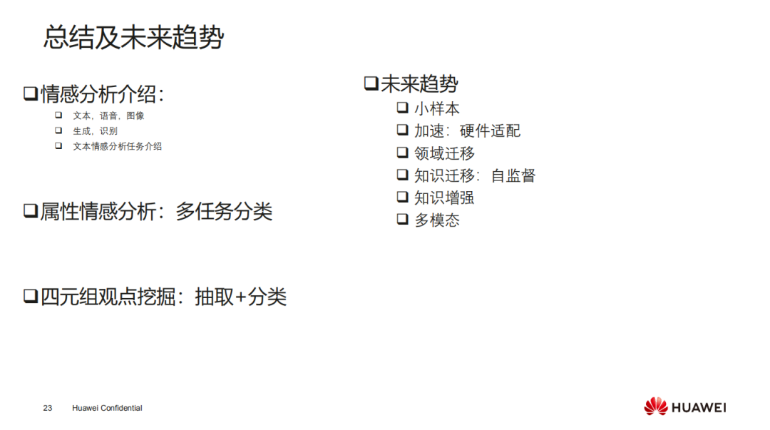 对于未来的趋势,我们在实际做的过程中发现大家在工业界会碰到标注数据成本非常高的问题,每一个任务基本上我们需要标将近两万条数据,所以最终的效果准确率是比较高的。另一方面,对于模型加速这部分,由于使用深度学习像bert这种预训练模型,它的推理成本还是比较高的,我们华为可以对硬件进行底层适配。对于领域迁移未来也是关注重点,怎么能从更低成本从某一领域迁移到另一个领域,比如从汽车领域迁移到手机领域,或者从手机领域迁移到房地产领域等等。另外,还有自监督去训练超大规模的模型,比如像bert、roberta还有最近GPT3等等,这也是未来的趋势,然后再考虑如何将知识图谱加入到大模型当中进行知识增强来提升模型理解的效果。还有就是多模态这部分,怎么把图像、文本或者语音这些信息辅助来提升模型的效果。因为人在学习的时候不仅参考了文本的信息,还有视觉方面的信息等等。现在对于多模态情感分析我们也有一些工作正在做,比如说从视频中分析出一个人的情感,既考虑人脸的图像信息,也考虑他语音的一些信息,比如语气等等。