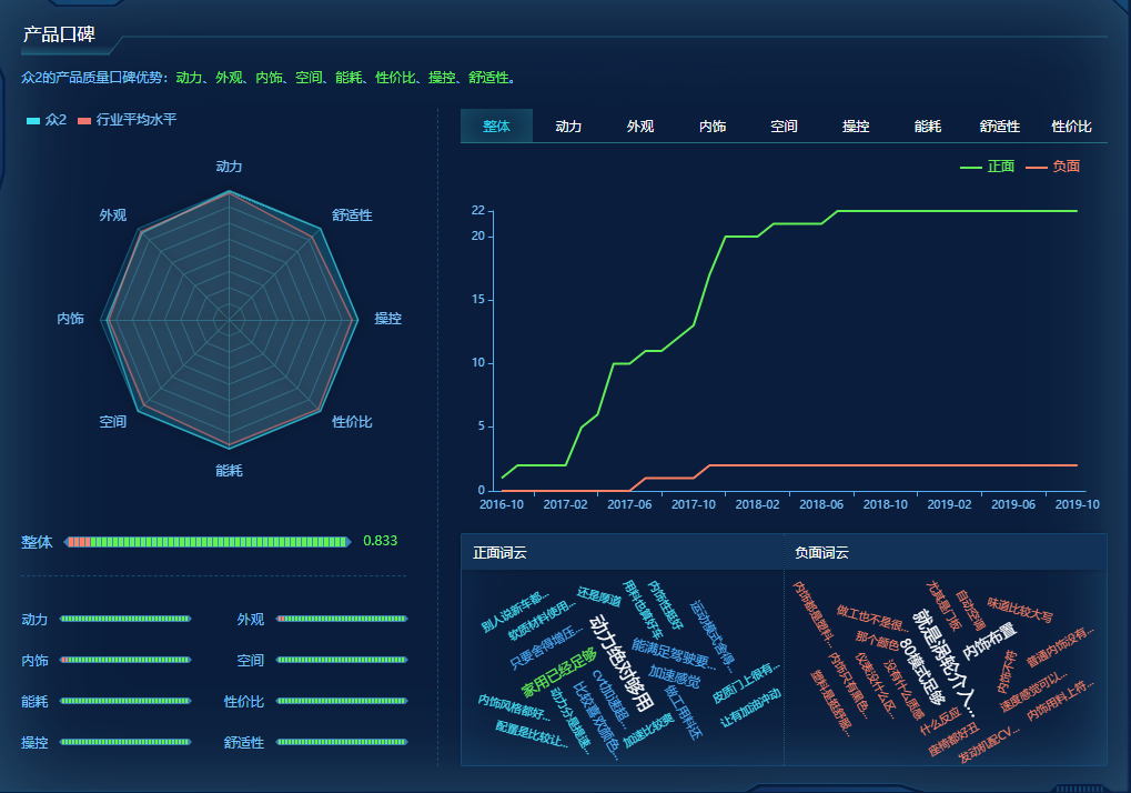 这是我们基于多属性情感分析的一个应用案例,这是汽车领域的案例,针对网上很多的汽车领域的评论,我们可以分析汽车在八个属性维度上的正负面评价。上图左上角里红色的线就是一个行业的平均水平,蓝色的线是针对这个车它的各个维度的雷达图像,这样就可以很方便地对比出不同车型,它的一个好坏。可以方便用户在产品选型的时候做一个对比,也可以方便厂家针对评论本身对他们的产品做相应的改进。