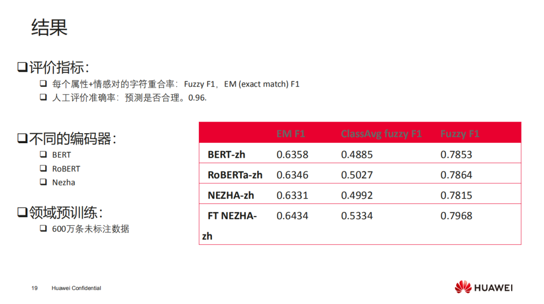 上图为我们最终的评价结果,因为它是一个四元组既包含分类也包含抽取,对于评价指标我们用了一个Fuzzy F1值。我们对每一个属性加正负面标签作为一个评价对象,比如“外观正”作为一个评价对象,然后去找它对应的位置,计算这个位置它们字符的重合率(包括观点描述词和属性描述词的重合率)这样去算它的F值。EM F1值是预测描述词的位置完全精准匹配,稍微有一点不对也算错,这个比前面的指标更加严格。