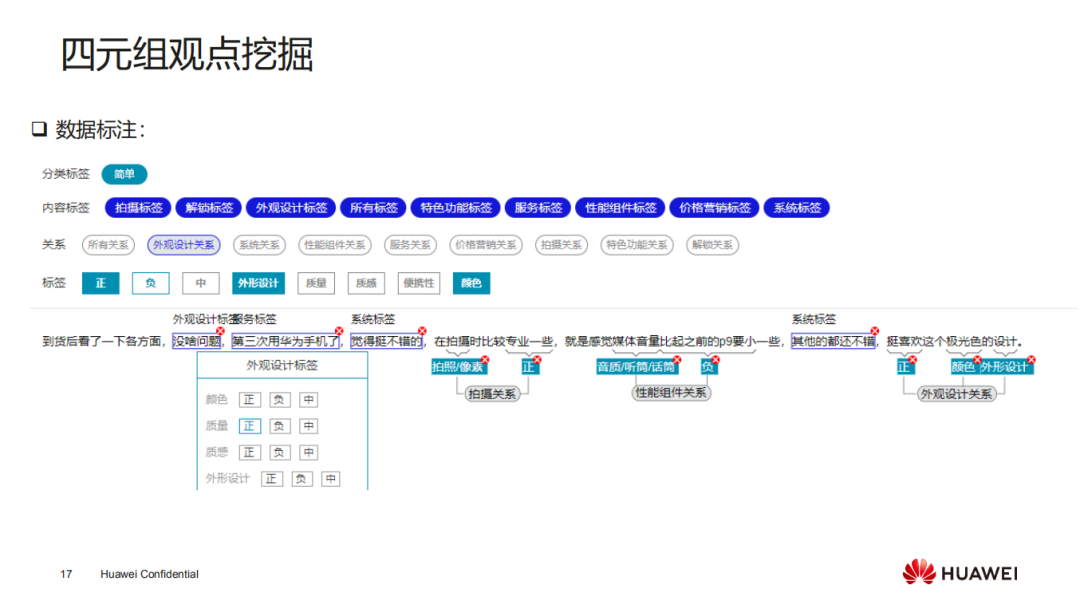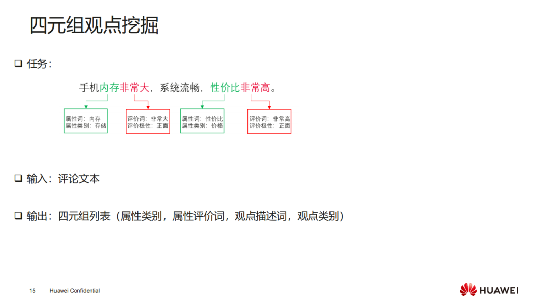上面讲到的虽然可以分析出各个属性的正负面,但是它的一个缺点是没办法定位出针对某个属性具体评价的属性描述词位置和观点描述的位置,因为有些用户不仅想要找到属性正负面,还要找到它对应的评价位置,所以我们这个工作是针对观点四元组进行挖掘的。