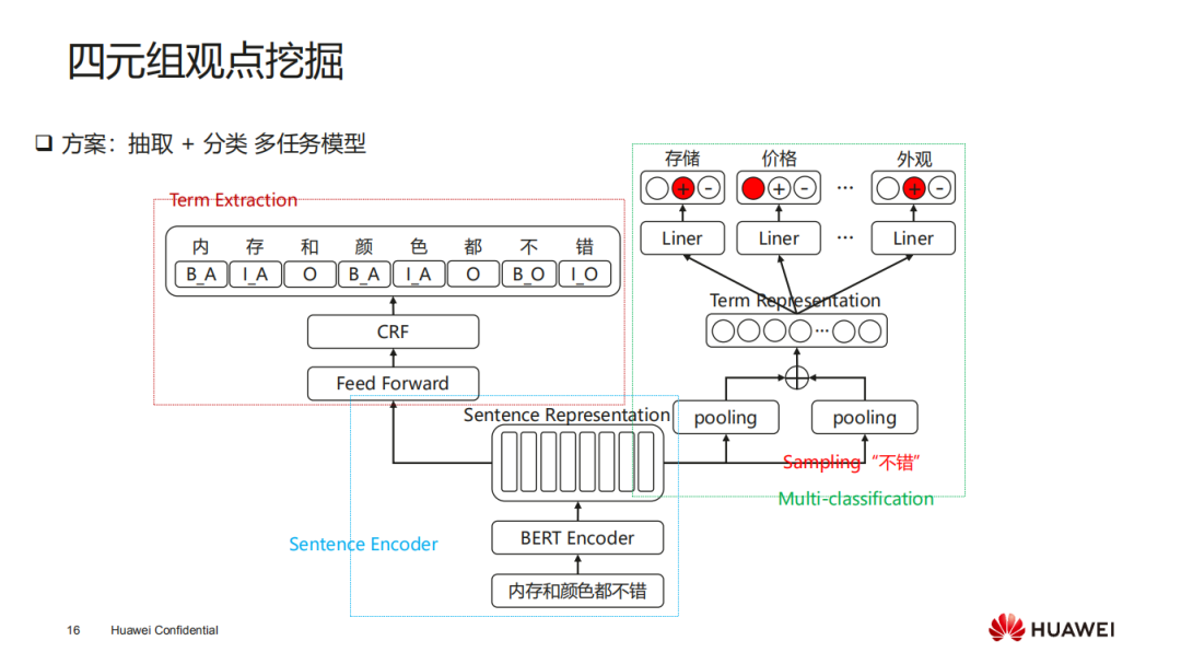 观点四元组挖掘这个任务不仅要分析出各个属性的正负面,还要定位出它属性描述词的位置以及观点描述词的位置。比如“手机内存非常大”中属性描述词定位到“内存”,评价词定位“非常大”,对于“性价比非常高”这句话,属性描述词定位到“性价比”,观点描述定位到“非常高”,不仅要识别出属性的类别还要定位到位置,所以这里一共有四个要素要预测出来,分别是属性词、属性类别、评价词和评价极性,其中属性类别和评价极性在前面的工作已经做到了。