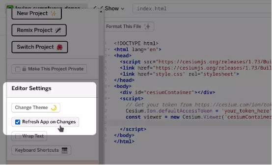 使用基础模板创建一个新的 Glitch 项目(https://glitch.com/edit/#!/remix/cesium-template)。