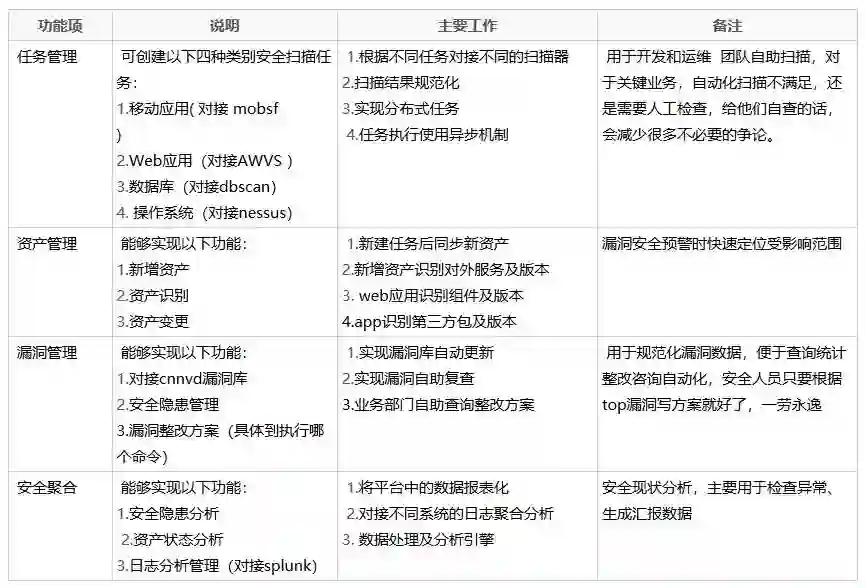 这个是身在甲方工作存活下去的重点,尤其是安全人员比较少的公司,先说说我们的管控平台吧,下边这个列表是我们当前已经完成的(毕竟属于公司资产,审批通过了,我就把这个系统开源,一个人维护这个系统很累的)。