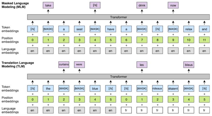 在BERT中,每个样本是用一种语言构建的。XLM对它的改进是每个训练样本都包含两种语言的相同文本。与BERT一样,该模型的目标是预测被屏蔽的词,但采用新的体系结构,该模型可以使用一种语言的上下文来预测另一种语言的词。因为不同语种的被屏蔽词是不同的(随机)。改造后的BERT表示为翻TLM(Translation Language Model),而带有BPE输入的“原始” BERT表示为MLM(Masked Language Model)。通过训练MLM和TLM并在它们之间交替进行训练来训练完整的模型。