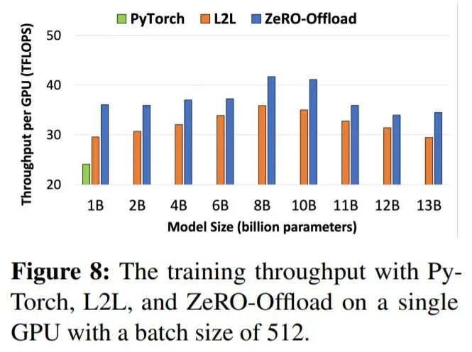 下图 8 展示了使用 PyTorch、L2L 和 ZeRO-Offload 实现的每个 GPU 吞吐量差异。从中可以看出,利用 ZeRO-Offload 实现的每个 GPU 吞吐量比 L2L 平均高出 14%(最多高出 22%)。