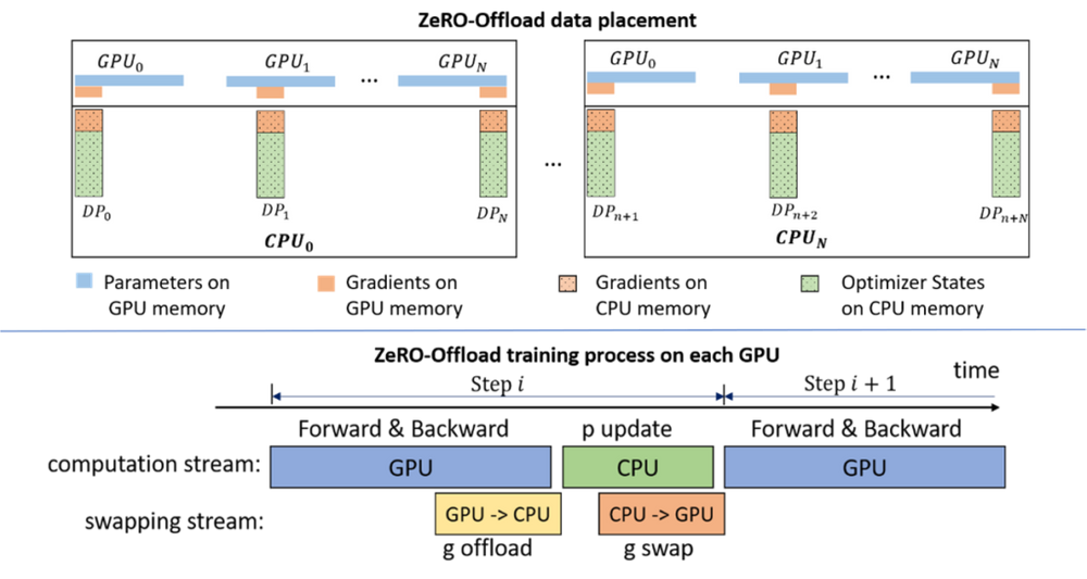 ZeRO-Offload 是一种通过将数据和计算从 GPU 卸载到 CPU,以此减少神经网络训练期间 GPU 内存占用的方法,该方法提供了更高的训练吞吐量,并避免了移动数据和在 CPU 上执行计算导致的减速问题。