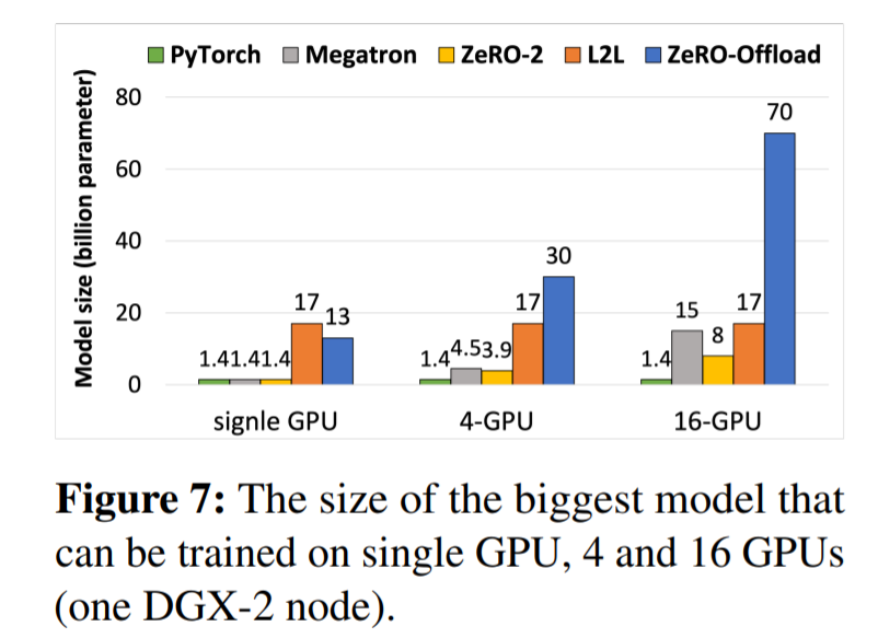 下图 7 展示了利用 ZeRO-Offload 技术在 1 个、4 个或 16 个 GPU(一个 DGX-2)上可以训练的最大模型情况。