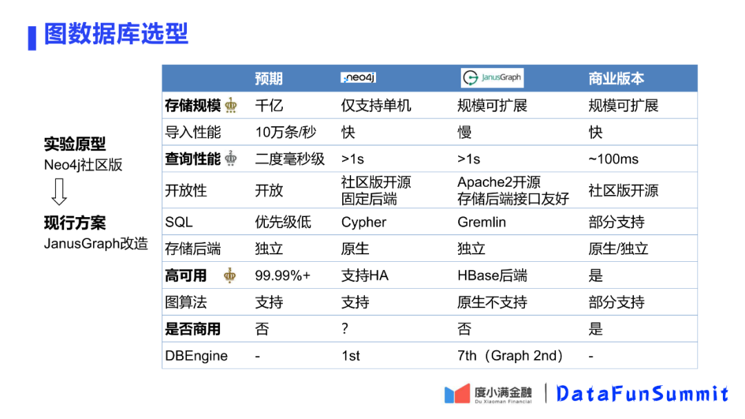 Neo4j只有HA,但不是分布式版本;除了本身集群的健壮性还要考虑是否有很好的运维方式。JanusGraph有HBase的后端,节省了运维成本。开源版本还是商业版本,商业版本健壮性高,但是一旦出现问题是否能及时进行处理不能保证;商业版本的私有化是封闭的版本,在这上面是否能做二次开发或者更深一步的优化,这个也是待考虑的问题。最后选择了JanusGraph,主要看中可扩展性。