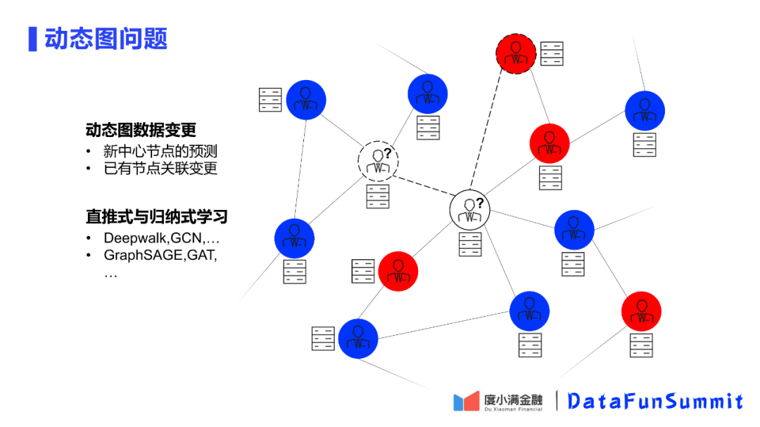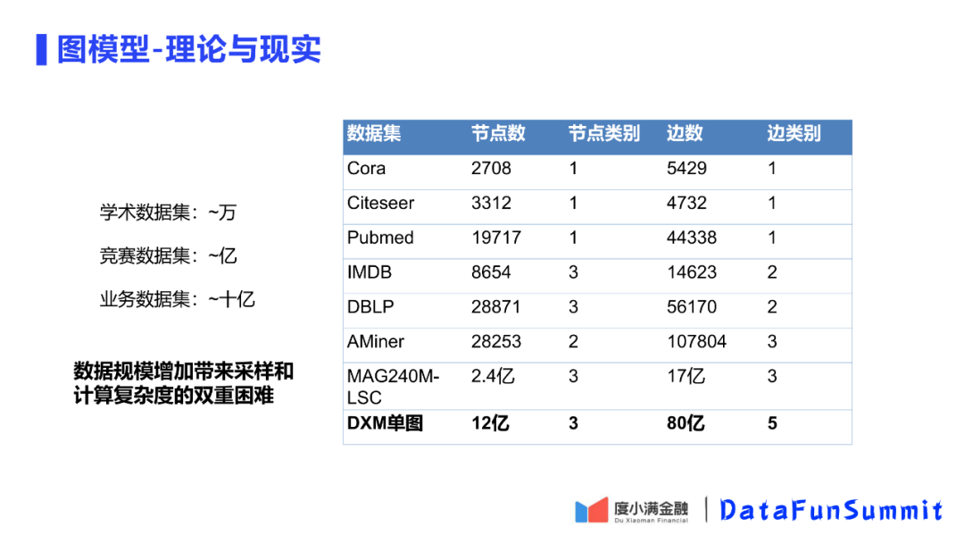 首先看一下实际遇到的问题与公开数据集的差异。表中前6行是公开模型数据,前3行是同构图数据、后3行是异构图数据。学术数据规模在10w以内,第7行的比赛数据,达到了亿级规模,这对于学术界是超大规模了。但度小满单个模型训练的数据集已经达到了10亿级别,比比赛的公开数据集又大出一个量级。所以学术数据集、竞赛数据集、业务数据集有一个巨大的鸿沟。另一方面图的数据是有关联的,例如Node2vec的邻接矩阵,当点边关系增加,矩阵规模会膨胀迅速,因此在训练中如何解决规模问题是训练中要考虑的重点。