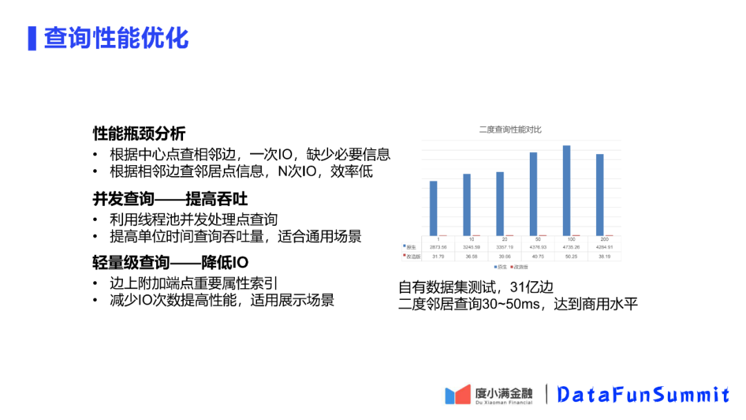 第二个优化点是降低IO,做轻量级查询。在平台应用场景中,我们首先呈现的是图的结构,而具体的节点信息用户需要点入再看到。这样在边索引时,我们可以将邻居节点的重要信息,例如ID加到可读的边上,减少IO的次数,这样查一度邻居只用一次IO,查二度邻居只用N次IO。这样在可视化场景可以对查询性能做一个很大的优化,表中可以看到二度查询提高了两个数量级。