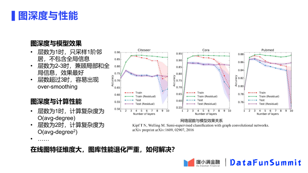 刚才讲到图模型的采样深度是两层的,这里引用GCN文章的一个评测结果进行分析,为什么会选择两层的采样深度。