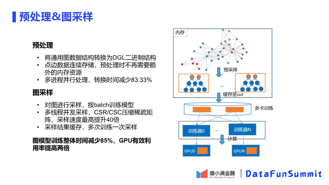 首先是对DGL训练预处理和采样阶段的优化。经过两步的整体优化后,减少了85%训练时间,提高了GPU利用率。