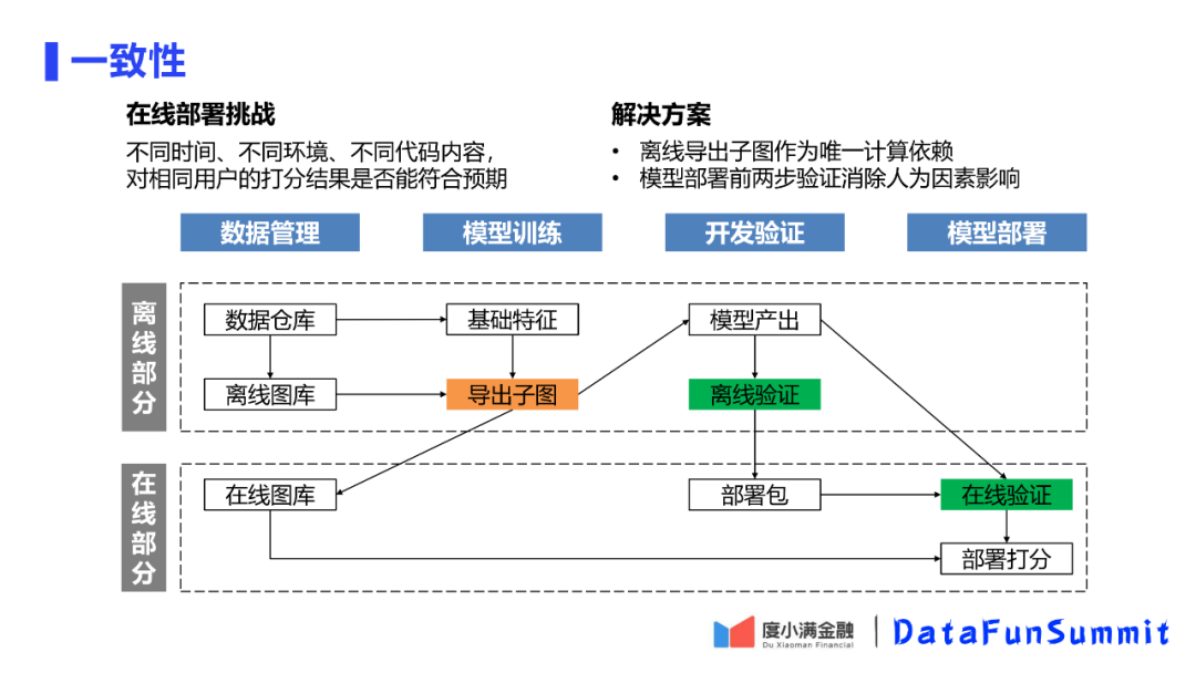 首先可以将整个在线打分的过程分为离线部分和在线部分。其中关键的部分是将数据仓库以及离线图库的导出子图作为离线训练和在线打分唯一的数据来源。既用于离线训练,也用于在线的数据导入。另外在部署模型包前要先做一次离线验证,保证本地打分与训练的结果是一致的。在模型部署上线后,也进行一次在线验证,保证在线环境得到的分数也和预期的一致。用数据一致性和计算一致性保证在线打分的一致性。