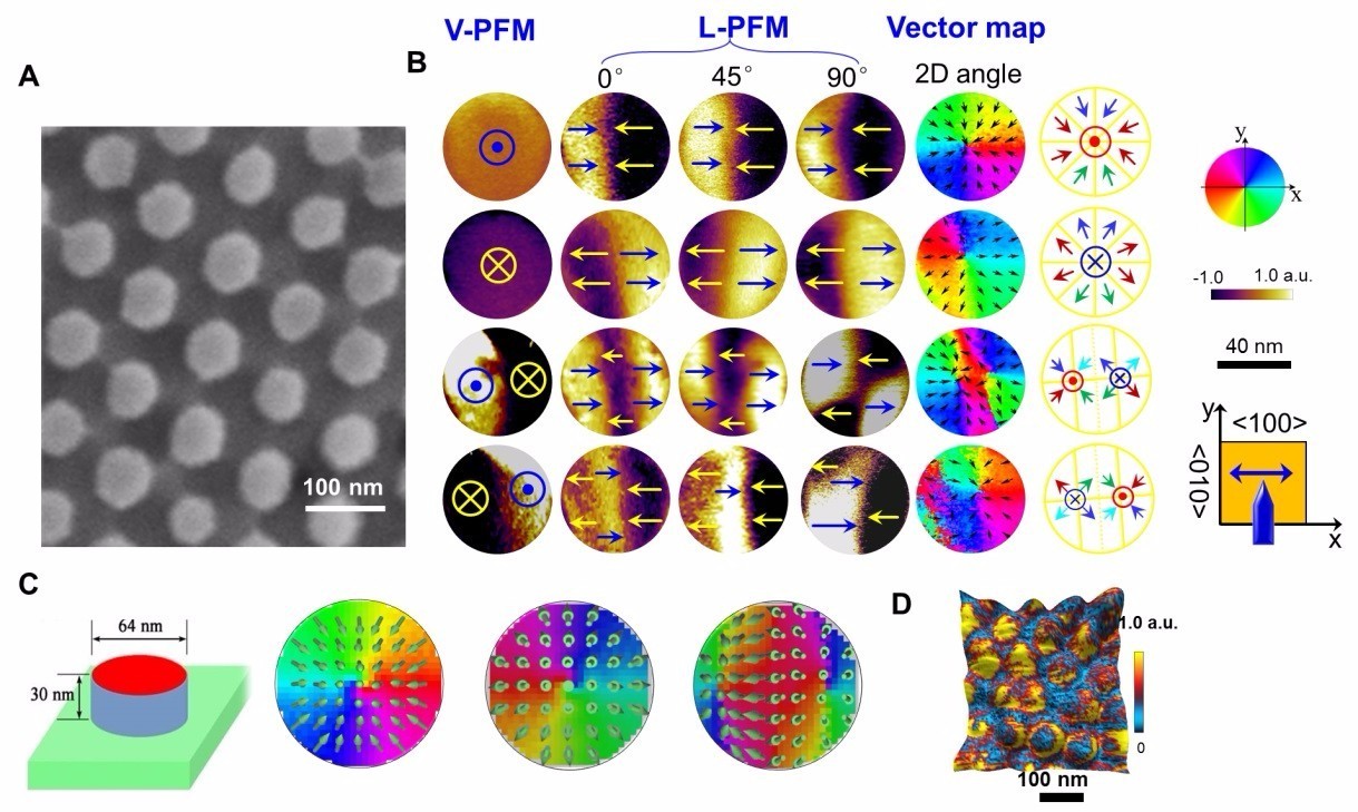 图2. 高密度外延BiFeO3纳米点阵列及几种典型中心型拓扑畴。(A)为纳米点阵列SEM像。(B)为纳米点中中心畴压电显微镜(PFM)像及相应畴结构:从左到右分别为压PFM面外像、不同样品转动角度的PFM面内像、通过压电显微像合成的面内极化分布图及对应的畴结构示意图。从上到下分别为:中心收敛型畴、中心发散型畴、收敛-发散双中心畴、中心发散-收敛双中心畴。其中收敛-发散型和发散-收敛型可认为等价结构。(C) 图为拓扑畴富集电荷辅助形成的相场模拟图:分别为纳米点中心畴的柱状模型,以及上表面正电荷富集、负电荷富集、一半正-半负电荷富集所对应的三维极化分布图;(D)为样品的扫描热离子显微镜成像(STIM)的振幅分布图与形貌叠加的合成图,表明离子(如氧空位)在纳米点表面不均匀分布,可为电荷纳米点中不同电荷富集状态的佐证。