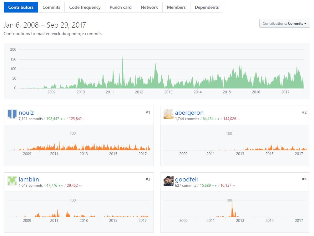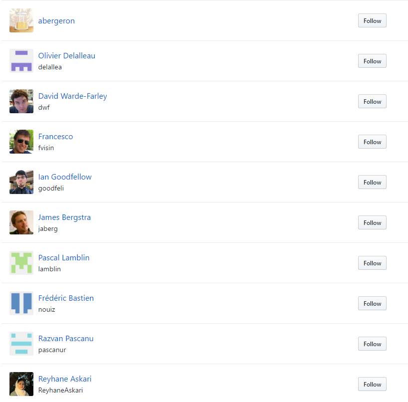 以下为 Theano GitHub 项目的开发者与维护者,可以看到谷歌研究科学家 Ian Goodfellow 也是其中之一: