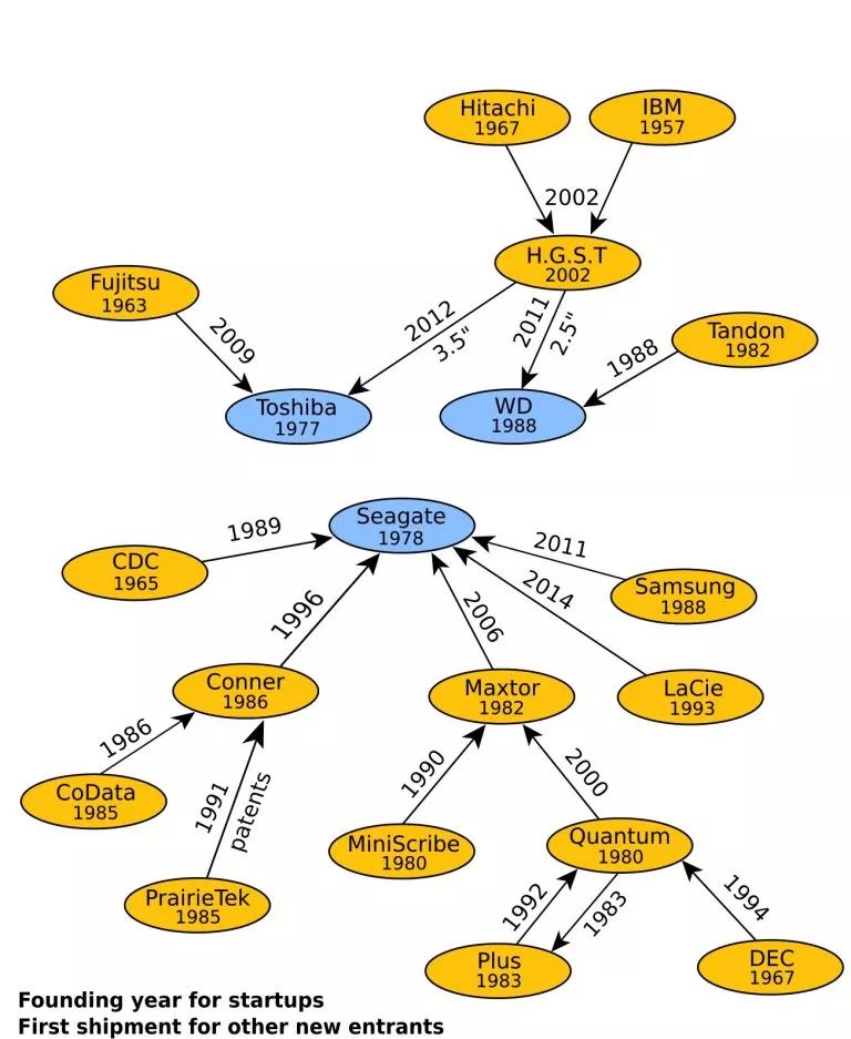 过去至少有221家公司是机械硬盘(HDD)厂商。由于破产或并购,这个行业的大多数玩家现已销声匿迹。最早进入的四家厂商如今没有一家继续深耕这个行业。如下图所示,存活下来的几家厂商是希捷、东芝和西部数据,它们都至少一方面是通过并购发展起来的。