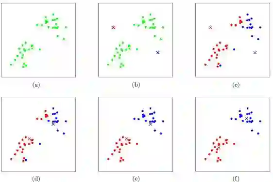 上图a表达了初始的数据集,假设k=2。在图b中,我们随机选择了两个k类所对应的类别质心,即图中的红色质心和蓝色质心,然后分别求样本中所有点到这两个质心的距离,并标记每个样本的类别为和该样本距离最小的质心的类别如图c所示,经过计算样本和红色质心和蓝色质心的距离,我们得到了所有样本点的第一轮迭代后的类别。此时我们对当前标记为红色和蓝色的点分别求其新的质心,如图d所示,新的红色质心和蓝色质心的位置已经发生了变动。图e和图f重复了我们在图c和图d的过程,即将所有点的类别标记为距离最近的质心的类别并求新的质心。最终我们得到的两个类别如图f。