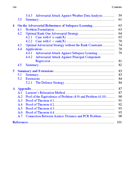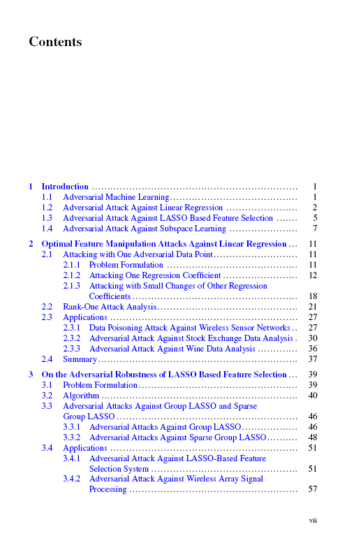 作者在本书中分别考察了信号处理中常用的三种机器学习算法:线性回归、基于lasso的特征选择和主成分分析(PCA)的对抗鲁棒性。对于线性回归,给出了最优中毒数据样本和最优特征修正,并证明了攻击无线分布式学习系统的有效性。作者进一步将线性回归扩展到基于lasso的特征选择,并研究了误导学习系统选择错误特征的最佳策略。作者通过解决一个双级优化问题找到了最优的攻击策略,并说明了这种攻击如何影响阵列信号处理和天气数据分析。最后,作者考虑了子空间学习问题的对抗鲁棒性。研究了能量约束下的最优修正策略,以欺骗基于PCA的子空间学习算法。