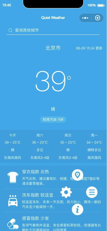 从上到下依次是:其他城市天气搜索、当前城市数据展示、当天和未来三天天气数据展示、当天生活指数展示、footer。下拉刷新会刷新当前地区的天气数据。其中,顶部城市天气搜索和生活指数可以在设置中隐藏。屏幕右下角是一个可以移动的悬浮球菜单,点击后会弹出城市选择、设置、关于页面的入口。背景色默认是 #40a7e7 纯色,可在设置中更换背景图,未来三天天气预报和生活指数分别添加了透明的黑色背景。最终实现图如下: