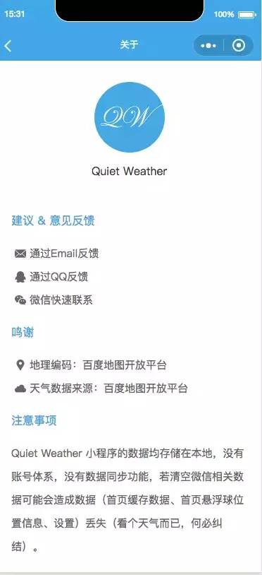关于页是一个展示页,没有多少交互,使用到的 API 只有复制到剪切板 wx.setClipboardData。“微信快速联系”使用的是小程序提供的联系客服的方式。有精力的话,可以自己搭建服务,将小程序的消息 Push 到自己的服务上去。效果图: