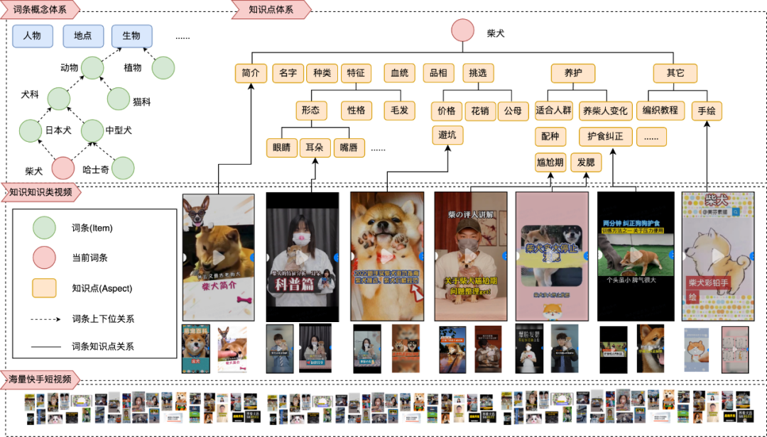 参考国家标准 [2] ,我们将事实(What)、原理(Why)类知识归结为科普知识,技能(How)类归结为教程知识,在快手海量的视频中挖掘出高质的知识视频。此外,我们将短视频中抽取的知识主体以词条形式呈现(如柴犬),并抽取视频中讲解的该词条具体的知识点(如柴犬 - 挑选、柴犬 - 护食纠正等),最终构成了一个短视频的百科知识体系,如图二所示。