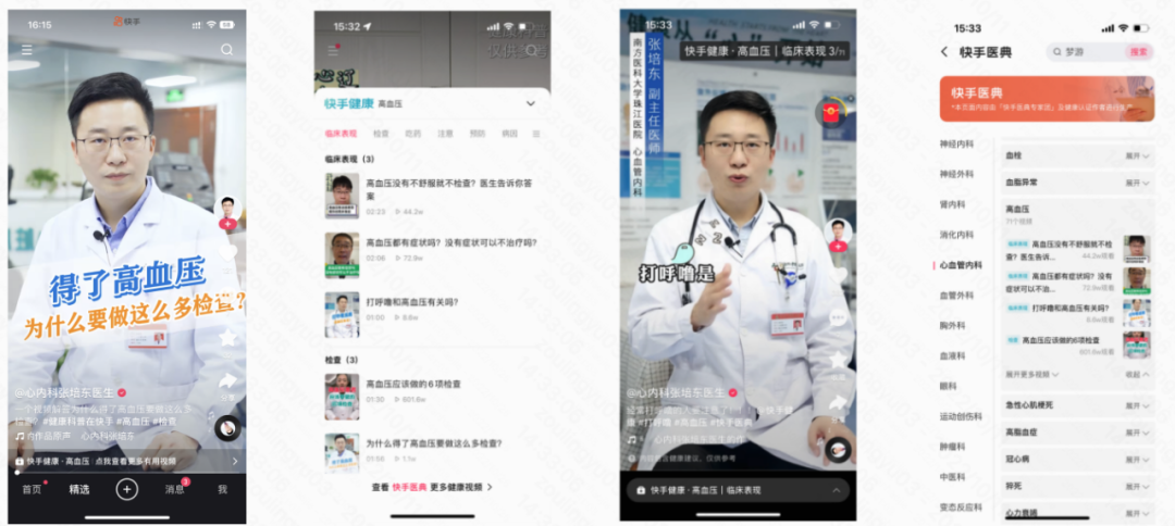 此外,“快知”在产业落地极具想象力,在短视频生态向 “泛知识” 拓展的过程中,现有的形式约束了其传播方式,“快知”通过结构化的内容,能提升平台的运营和分发效率,更好地满足用户的求知诉求。我们将该项技术首先在健康垂类进行了落地尝试,快手健康团队此前以病种为组织维度,纯人工挖掘了一批优质 PUGC 内容,但是存在疾病知识体系不完善、权威性知识视频量级小等痛点,难以高效率构建完整、大规模、结构化的疾病视频体系。利用 “快知” 的技术后,自动化地挖掘出了一批高质量、有快手特色的知识点和知识视频,丰富了疾病类内容,比纯人工构建提效几十倍。目前这批内容已经在快手 App 精选页上线:点击精选视频流中某个疾病类视频的「底部通栏」,唤起「快手健康」半屏页,用户可以消费该视频所属词条下的相关知识点和相关知识视频,如图四所示。