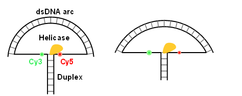 5、2017年发展了高精度荧光共振能量转移技术。以往的荧光共振能量转移技术在对于解旋酶研究上只能达到2-3bp的分辨精度,而2017年发展的纳米张力器技术,通过对单链核苷酸链施加一小段双链DNA的刚性弹力作用,使得荧光共振能量转移技术在对解旋酶研究上提高到0.5个碱基对的精度,促进对解旋酶和聚合酶更统一、更基础的分子机制研究。